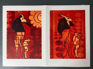 ERNST, TANNING. GIRAUDOUX (Jean). Judith. Tragödie in drei Akten. Stuttgart, Manus Press, 1972. In-folio, en feuilles, chemise et étui éditeur toilé orange. Traduction allemande de la pièce de Jean Giraudoux. 12 lithographiée en couleurs à pleine page, dont six de Max Ernst, et six de Dorothea Tanning. Tirage limité à 500 exemplaires sur vélin d'Arches signés au crayon par Max Ernst et Dorothea Tanning (n° 76).