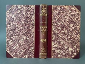 HUGO (Victor). Cromwell. Paris, Ambroise Dupont et Cie, 1828. In-8, demi-maroquin à longs grains bordeaux à coins post., dos lisse, auteur et titre doré, large décor d'encadrement à volutes feuillagées, filet et pointillé dorés, filet doré aux plats, tête dorée (dos lég. passé ; rares rouss. claires et éparses, tache brune causée par un transfert au bord int. du titre, déchirure en marge restaurée à p. I, une marge remplacée au faux-titre). Édition originale. (Carteret, I, 398).
