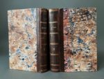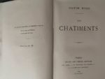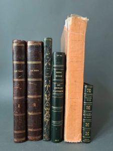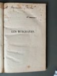 HUGO (Victor). Ensemble de 6 volumes. - Le Rhin. Lettres à un ami. Paris, H. L. Delloye, 1842. 2 vol. in-8, [2] f., XXX p., [1] f. (2e faux-titre), 368 p. + [2] f., 656 p., demi-basane brun post., dos lisse, titre, tomaison et filets dorés, nom de possesseur masqué en queue, restaurations (gardes renouvelées, taches, brunissures). Édition originale de cet ouvrage « important et rare » (Carteret, I, 412). - Les Burgraves, trilogie. Paris, E. Michaud, 1843. In-8, XXIX p., [1] f., 188 p., [2] f., demi-veau vert époque, dos lisse, auteur et titre dorés, fleuons en long (coins émoussé, dos remplacé avec fragments conservés du dos original ; rousseurs et piqûres). Edition originale. (Carteret I, 414). Envoi autographe signé : « l'auteur » (?), à Maurice (?) Riché. - Les feuilles d'automne. Les chants du crépuscule. Paris, Charpentier, 1842. In-12, [2] f., 302 p., simili-maroquin vert moderne, dos à cinq nerfs, titre, date et auteur dorés, chasses dorées à la roulette, encadrement de filet doré aux plats, tête dorée, couv. conservées (rousseurs parfois soutenues). Nouvelle édition. Etiquette ex-libris Charles Mundtveiller. - Les châtiments. Paris, Michel Levy frères, 1875. Grand in-8, [2] f., XI-455 p., broché, non coupé et non rogné. Nouvelle édition qui reproduit la première édition française parue en 1870. Tiré à 100 exemplaires numérotés : l'un des 80 sur Hollande numéroté 57. - Napoléon le Petit. Amsterdam, Stemvers, 1868. In-32, [2] f., 284 p., simili-maroquin vert moderne, dos à cinq nerfs, auteur, titre, date et fleurons dorés, fleurons aux coins et filet d'encadrement aux plats, roulette dorée aux chasses, tête dorée, couv. conservée (rousseurs). Nouvelle édition au format de l'originale. Mention d'adresse « Genève et New-York » sur la couverture. Petite photographie ancienne d'une caricature de Napoléon III insérée après le titre. Ex-libris manuscrit ancien (signature) au faux-titre.