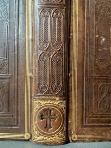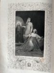 JOHANNOT. IMITATION (L') de Jésus-Christ. Paris, Curmer, 1856. In-4, VIII-454 p., basane havane, dos lisse, titre, relieur et encadrement dorés, croix et vitraux à froid, choeur architecturé estampé à froid sur les plats dans quadruple filet d'encadrement doré et rosaces dorées aux écoinçons, le plat central centré du chiffre doré B.T., tranches dorées, dentelle dorée [Simier, Relieur du Roi] (frottements, épid. au plat inf., 2 coins frottés ; rousseurs). Premier tirage de l'illustration Tony Johannot et Cavelier, 10 planches gravées sur acier, et larges encadrements de texte répétés Ex-libris manuscrit à la mine de plomb : Banières Pourtodon de Caraman (?)".
