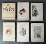 MAUPASSANT (Guy de). 6 ouvrages. - Cinq contes. Eaux-fortes de Gaston Nick. Paris, Kieffer, 1928. Petit in-4, broché (couv. insolée). Tiré à 500 exemplaires : un des 450 sur vélin blanc. - 5 volumes publiés à Paris chez Ollendorff, grand in-8, brochés (des dos fendillés) : 1. Une vie. Illustrations de A. Leroux. 1901. Un des 30 exemplaires de tête sur japon (n° 27). Qq. rousseurs. 2. Le Horla. Illustrations de Julian-Damazy. 1903. Un des 20 ex. sur Chine, 2e papier après 10 japon. 3. Fort comme la mort. Illustrations de André Brouillet. 1903. Un des 20 ex. sur Chine, 2e papier après 10 japon. 4. Au soleil. Illustration d'André Suréda. 1902. Un des 20 ex. sur Chine, 2e papier après 10 japon. 5. La vie errante. Illustrations de Lanos. 1903. Un des 25 exemplaires sur vélin, dernier papier après 10 japon et 20 Chine. Soit 6 volumes.