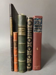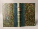 MONSELET (Charles). Ensemble de 5 vol. - Les créanciers. Oeuvre de vengeance... Paris, René Pincebourde, 1870. In-16, VI-45 p., demi-chagrin noir époque, dos à quatre nerfs, pièce de titre verte en long, date en queue. Edition originale illustrée d'une cruelle gravure à l'eau-forte par Emile Benassit. Tirée à 225 ex. : un des 100 sur vélin teinté, le 127 ; avec l'eau-forte en 3 états. Etiquette ex-libris Jules Richard. - Figurines parisiennes. Paris, Jules Dagneau, 1854. In-16, 132 p., [1] f., demi-veau fauve époque, dos à quatre nerfs, pièce de titre vert olive (mors usés, coiffes découvertes ; rousseurs). Edition originale. - Une troupe de comédiens. Paris, Tresse, 1879. In-18, [2] f., 282 p., demi-chagrin vert époque, dos à cinq nerfs, titre et auteur dorés, date en queue (dos passé, coins un peu frottés, brunissures). Edition originale. Etiquette ex-libris Charles Marret. - Monsieur de Cupidon. Paris, Librairie nouvelle, 1858. In-18, [2] f., 352 p., demi-maroquin vert époque, dos à cinq nerfs, auteur et titre dorés, caissons ornés aux petits fers, tête dorée (qq. rousseurs). Seconde édition. - La franc-maçonnerie des femmes. Paris, A. Bourdillat, 1861. In-18, [2] f., 439 p., [1] f., reliure à la Bradel, demi-percaline violine à la Bradel, dos lisse, pièce de titre bleue, date et éditeur en queue, couv. conservée (pièce de titre frottée, coins ém., bruniss., mouill. très claire dans des marges de tête). 4ème édition.