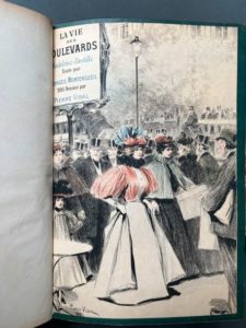 MONTORGUEIL (Georges). La vie des boulevards. Madeleine - Bastille. Paris, Librairies-imprimeries réunies, 1896. Grand in-8, [2] f., XI-258 p., [2] f., demi-chagrin à coins bleu époque, dos à cinq nerfs, auteur, titre et fleurons dorés, tête dorée, couv. conservé (frottements, coins émoussés). Edition originale, illustrée de 200 gravures en couleurs de Pierre Vidal. Tirée à 500 exemplaires sur vélin, celui-ci n° 484.