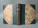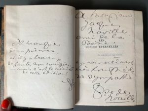 NOAILLES (Anna de). Les forces éternelles. Paris, Fayard, 1920. In-16, demi-maroquin à coins vert sapin, dos à 2 nerfs saillants bordant les nom d'auteur et titre dorés, filets à froid et roulettes dorées en long, tête dorée, couverture, dos et témoins conservés [Trinkvel]. Edition originale : un des 225 (n° 171) sur Hollande Van Gelder Zonen. Bel envoi autographe signé de l'auteur à Jacques Naville, lui expliquant que les fautes figurant dans cette édition en font le mérite (elles furent corrigées par la suite). Une nouvelle édition fut publiée par Fayard la même année. Un feuillet correctif inséré à l'époque a bruni les p.118 et 119. Ex-libris gravé érotique aux initiales "P.W".