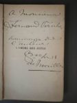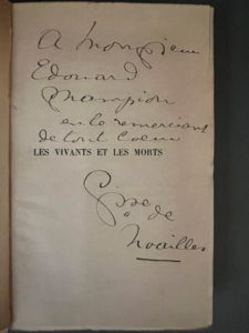 NOAILLES (Anna de). Ensemble de 7 ouvrages. - Exactitudes. Paris, Bernard Grasset, 1930. Petit in-4, XX-230 p., [1] f., broché. Edition originale tirée à 724 exemplaires : un des 30 sur vélin d'Arches (n° 15) au format in-4° tellière. Non coupé. - L'ombre des jours. Paris, Calmann-Lévy, 1902. In-12, [2] f., 182 p., [1] f., broché (dos usé, couv. détachée). Edition originale. Envoi autographe signé de l'auteur à Fernand Vernhs. - Poèmes de l'amour. Paris, Arthème Fayard, 1924. In-12, 221 p., [1] f., broché Edition originale. - Les vivants et les morts. Paris, Arthème Fayard, 1913. In-12, [2] f., 352 p., [2] f., broché. Edition originale, exemplaire spécialement tiré pour l'auteur sur papier vergé. Envoi autographe de l'auteur à Edouard Champion. Jointe une invitation aux obsèques de la comtesse de Noailles à la Madeleine. - Le coeur innombrable. Paris, Calmann Lévy, [1901] s.d. In-12, [3] f., 192 p., [1] f., reliure à la Bradel, demi-percaline à coins saumon, dos lisse, pièce de titre en basane brune, tête dorée, couv. et dos conservés [Lemardeley] (qq. rouss.). Edition originale. - Les innocentes ou la sagesse des femmes. Paris, Fayard, 1923. In-12, [1] f., 254 p., [1] f., broché, témoins conservés Edition originale tirée à 640 exemplaires : un des 325 sur vélin pur fil Lafuma, n° 444. - De la Rive d'Europe à la rive d'Asie. Paris, Dorbon-Aîné, [1913]. In-8, [1] f., 130 p., [1] f., broché, couv. rempliée (couv. un peu défraîchie). Edition originale à 525 exemplaires sur papier Edogawa du Japon : un des 500 ordinaires.