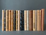 [Cartonnage NRF] [Mario Prassinos] [Paul Bonet]. Ensemble de 18 ouvrages en 18 vo. in-12, cartonnage éditeur d'après les maquettets de Mario Prassinos ou de Paul Bonet. Paris, Gallimard. (dos brunis, lég. frott. aux coiffes). D'après les maquettes de Mario Prassinos : - BECK (Béatrix). Léon Morin, prêtre. Roman. 1952. Ex. sur Alfa mousse n° 171 (rouss. au cartonnage). - BECKER (Lucien). Le monde sans joie. 1945. Ex. sur châtaignier n° 741. Nouvelle série Une oeuvre, Un portrait. Portrait-fronstipice lithographié de l'auteur par Fraggi. - BERNARD (Marc). Pareils à des enfants. 1943. Ex. sur héliona n° 707. - CALDWELL (Erskine). La route au tabac (Tobacco road). Roman. 1947. Ex. sur alfa n° 1988. (dos passé, taches au cart.). - CALDWELL (Erskine). Le petit arpent du bon dieu. 1946. Ex. n° 807. (dos passé) - DOSTOIEVSKI. Mémoires écrits dans un souterrain. 1949. Ex. sur alfa n° 434. (charn. sup. fendue). - GUILLOUX (Louis). Parpagnacco ou La conjuration. Roman. 1954. Ex. sur vélin labeur n° 204. - PAULHAN (Jean). Entretien sur des faits divers. 1945. Ex. n° 201. Illustrations de André Lhote. - SARTRE (Jean-Paul). Situations, III. 1949. Ex. sur alfa n° 641. (rousseurs). D'après les maquettes de Paul Bonet. Paris, Gallimard. - BEDEL (Maurice). Jérôme. 60° latitude nord. 1947. Ex. sur alfa Navarre n° 662. - CLAUDEL (Paul). Poèmes & paroles durant la guerre de trente ans. 1945. N° 906. - MAC ORLAN (Pierre). Le camp Domineau. Roman. 1949. Ex. sur alfa n° 253. - MARTIN DU GARD (Roger). Jean Barois. 1946. N° 568. - MONTHERLANT (Henry de). La ville dont le prince est un enfant. 1951. Trois actes. Edition originale. Ex. sur vélin labeur n°2202. Provenance : étiquette ex-libris gravé J.L. à décor de Hermès enfant sur un dauphin. - SAINT-EXUPÉRY (Antoine de). Pilote de guerre. 1947. Ex. sur alfa n° 133. - VALÉRY (Paul). Monsieur Teste. Nouvelle édition augmentée de fragments inédits. 1946. Ex. sur alfa n° 171. (rousseurs). - VALÉRY (Paul). Mon Faust. Ebauches. 1946. N° 694. On y joint : - VALÉRY (Paul). Poésies. Albums de vers anciens. La jeune Parque. Charmes. 1941.Ex. sur alfax n° 1662. Cartonnage rouge éditeur, le plat central décoré.(dos passés, charnières fendues). Soit 18 volumes.