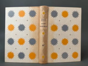 [Cartonnage NRF] [Paul Bonet]. PROUST (Marcel). Contre Sainte-Beuve [Suivi de] Nouveaux mélanges.Paris, NRF, 1954. In-12, cartonnage éditeur d'après la maquette de Paul Bonet (dos insolé, coiffe de têt lég. frotté). Édition originale. Ex. sur vélin labeur n° 1538. Provenance : étiquette ex-libris gravé J.L. à décor de Hermès enfant sur un dauphin.