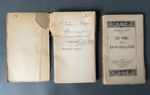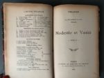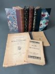 PÉLADAN (Joséphin). Ensemble de 7 ouvrages. - La décadence latine. Éthopée, VII. Coeur en peine. Paris, Dentu, 1890. In-18, XLVII-330 p., demi-chagrin violet début XXe s., dos à cinq nerfs, titre et auteur dorés, date en queue, couv. conservée (marges jaunies). Edition originale illustrée d'un portrait. - La décadence latine. Éthopée, VIII. L'Androgyne. Paris, Dentu, 1891. In-18, XX-303 p., rel. récente demi-basane à coins noire, dos à cinq nerfs, auteur, titre, fleurons et date dorés, tête argentée (papier jauni). Edition originale. Illustrée d'une eau-forte d'Armand Point en frontispice. Envoi autographe de l'auteur à Fr[édéric] Masson. - La décadence latine. (Éthopée [XVI].) Modestie et vanité. Paris, Mercure de France, 1902. In-18, 361 p., [2] f., (dont un blanc), 8 p. (catalogue), demi-chagrin brun époque, dos à cinq nerfs, fleurons, titre et auteur dorés, date en queue, tête dorée (coins frottés, dos taché et reteint ; papier jauni, marges fragiles). Edition originale. - Les dévotes vaincues. Paris, Éditions du monde nouveau, 1923. In-16, 253 p., [1] f., rel. récente demi-chagrin poli à coins bleu, dos à cinq nerfs, titre, auteur, date et fleurons dorés, date en queue, tête dorée, couv. et dos conservés (papier bruni). Edition originale. - La décadence esthétique, I. L'art ochlocratique. Salons de 1882 & de 1883. Avec une lettre de J. Barbey d'Aurevilly... Paris, Camille Dalou, 1888. In-8, XII-216 p., broché (couv. défraîchie, qq. rous.). Edition originale illustrée du portrait de l'auteur en héliogravure d'après une photographie de Cayol. - Le voeu de la renaissance. Paris, Sansot, [v. 1920]. In-24, 96 p., broché (dos frotté, papier bruni). Seconde édition. - L'athlétie et la statuaire antiques. Paris, Sansot, [v. 1914]. In-, 93 p., [3] f., broché, (dos absent, couv. usée) Edition originale. Envoi autographe signé de l'auteur à Frédéric Masson.