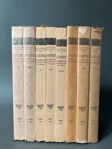 PROUST (Marcel). OEuvres complètes... À la recherche du temps perdu, tome 1, 2 et 3. Paris, NRF (Coll. In-octavo). Trois titres en 8 volumes grand in-8, brochés. 1. Du côté de chez Swann. 1933, 2 vol. - 2. À l'ombre des jeunes filles en fleurs. 1929. 3 vol. - 3. Le côté de Guermantes. 1930. 3 vol. Exemplaires numérotés.