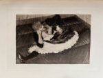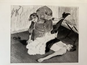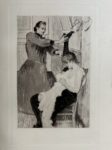LEGRAND. [RODRIGUES-HENRIQUES (Eugène)]. Cours de danse fin de siècle. Paris, Dentu, 1892. Grand in-8, [2] f.,59 p., [2] f. maroquin rouge, dos à 5 nerfs orné, titre doré, caissons et plats bordés d'un double filet doré, filet doré aux coupes, dentelle intérieure, tête dorée, non rogné, couv. ill. et dos conservés [Duval] (mors fendillés, l'un d'eux restauré ; 2 pl. interverties). Premier tirage des 11 eaux-fortes originales en noir de Louis Legrand (1863-1951), dont un frontispice, toutes protégées par des serpentes légendées. Le frontispice est répété sur la couverture, tiré en bleu. L'illustration est complétée par 23 vignettes en couleurs in-texte, certaines répétées, bandeaux, lettrines, culs-de-lampe. Tirage limité à 350 exemplaires, celui-sur vélin. Louis Legrand fut élève de Félicien Rops. « En 1891, il participe avec une série d'illustrations en couleurs, au Gil Blas illustré consacré à un reportage sur le cancan et ses principaux interprètes écrit par Érastène Ramiro et décrivant l'entraînement sévère auquel les danseurs se soumettent. Vendu à un très grand nombre d'exemplaires, le magazine fait connaître Legrand à travers la France. Fort de ce succès, l'éditeur Dentu persuade Louis Legrand de réaliser des eaux-fortes de ces mêmes aquarelles afin de les publier l'année suivante avec le texte revu de Ramiro. » (Louis Legrand. Cat. expo. Musée Félicien Rops, 2006). Envoi autographe signé de l'artiste, peu lisible. (Vicaire II, 1053).