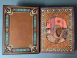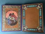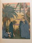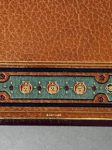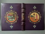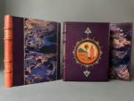 [SCHMIED]. SURÉDA. THARAUD (Jérôme et Jean). Marrakech ou les seigneurs de l'Atlas. Lyon, Cercle Lyonnais du livre, 1924. In-4, maroquin violet, dos à 4 nerfs saillants, auteurs, titre et date dorés, fleuron central mosaïqué à décor de croissants de lune, les plats mosaïqués chacun d'une vue dans un médaillon rond au croissant de lune dans une frise polylobée de fleurons stylisés, la mosquée Koutoubia au plat sup., une fontaine dans un parc au plat inf., les contreplats doublés de maroquin tabac mosaïqués à riche décor de croissants de lune, fleurons et fleurs stylisées, gardes ornées d'une soierie peinte dans un carde ornemental, l'une au portait d'un marocain, l'autre de deux femmes à l'enfant, tranches dorées sur témoins, filet et pointillé aux coupes, couv. et dos conservés, chemise à rabats assortie, étui bordé [G. Levitzky] (dos de la chemise et bords de l'étui insolés). Ouvre illustré de 66 compositions en couleurs, dont 9 planches, ou en camaïeu de gris d'André Suréda interprétées en gravure sur bois par François Louis Schmied qui a composé 17 lettrines dorées ou argentées, la couverture, la typographie et exécuté l'impression sur ses presses à bois. Tirage limité à 152 exemplaires sur japon nacré : un des 20 mis dans le commerce (n° II), les autres réservés aux membres de la Société Le Cercle Lyonnais du Livre ou aux collaborateurs. Remarquable reliure parfaitement exécutée par Gregory Levitzky (1885-1969), originaire d'Ukraine et établi en France où il se distingua comme l'un des meilleurs de son temps.