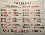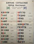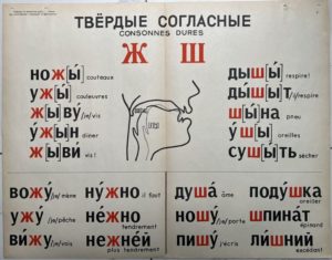 VASSILIEVA (A.N.). Tables pour l'étude phonétique du russe, à l'usage des étrangers de langue française [Tablitsi po fonetice roeskovo jaziva: pa sovije dija inostrautsev, gorvorjaszich na frantsoezsuan jazinje]. Moscou, s.n., 1961. In-folio, en feuilles, 29 planches doubles, portefeuille à tabatséditeur demi-toile rouge [35 x 56 cm], plats cartonnés jaune avec titre en russe imprimé en vert et rouge (portefeuille frotté, dos restauré, 1 coin émoussé, mouillure au plat sup. ; petites pliures pl. 1 et 2, deux petites déch. pl. 1 à la pliure, mouillure claire au v° pl. 19 sans att. au r°). Table au contre-plat en français, planches percées d'oeillets et numérotées, imprimées en noir, rouge, bleu et vert, en caractères grand format russe ou français, certaines planches illustrées. La première planche indique : "en russe, l'accentuation est mobile et toute syllabe peut être accentuée".