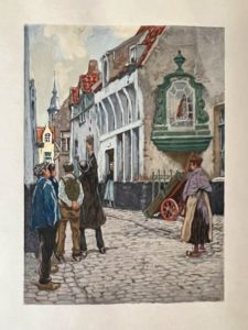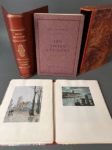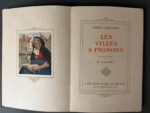 CASSIERS. VERHAEREN (Émile). Les villes à pignons. Paris, Piazza, 1922. In-8, broché, couv. rempliée, la suite dans une chemise simili-basane havane, le tout dans une chemise simili-maroquin havane, dos à 4 nerfs, auteur, titre, illustrateur, date, frise et filet dorés, étui bordé (étui un peu frotté, dos de la couv.). 41 compositions en couleurs dont 16 à pleine page d'Henri Cassiers. Tirage à 900 exemplaires : un des 40 de tête sur japon contenant une suite en couleurs sur japon et une suite en noir sur vélin (n°39).