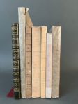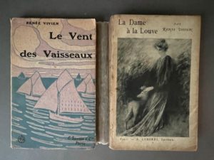 VIVIEN (Renée). Ensemble de 7 ouvrages. - Cendres et poussières. Paris, Alphonse Lemerre, 1902. In-12, [3] f., 120 p., [1] f., demi-chagrin poli vert foncé à coins époque, dos à cinq nerfs, caissons ornés aux petits fers, auteur et titre dorés, tête dorée (un coin plié). - Haillons. Paris, Sansot, 1910. In-8, 103 p., broché (dos usé ; rousseurs). Edition originale. (C. Bac, Inventaire, 2003, p.155). - Le vent des vaisseaux. Paris, Sansot, 1910. In-12, 103 p., broché. Deuxième édition. (C. Bac, Inventaire, 2003, p.163). - Une femme m'apparut. Paris, Alphonse Lemerre, 1905. In-12, [4] f., 226 p., [1] f., broché, couverture illustrée (dos cassé, rouss. aux gardes). - Brumes de fjords. Paris, Alphonse Lemerre, 1902. In-12, [2] f., 122 p., [1] f., broché (déch. en marge du f. de table, faux-titre bruni). Edition originale. (C. Bac, Inventaire, 2003, p.173). - Vagabondages. Poèmes en prose. Paris, Edward Sansot, s.d [1917]. In-12, 104 p., broché (papier jauni). Edition originale posthume. Tirage à 270 exemplaires : un des 200 sur vergé (n° 87). (C. Bac, Inventaire, 2003, p.169). - La dame à la louve. Paris, A. Lemerre, 1904. In-12, [3] f., 224 p., [1] f., broché, couv. illustrée (marges brunies). Edition originale. (C. Bac, Inventaire, 2003, p.101).