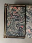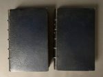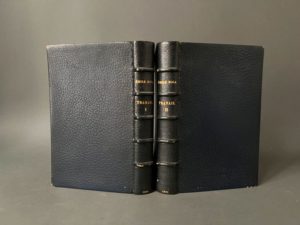 ZOLA (Emile). Les quatre évangiles. Travail. Paris, Bibl. Charpentier, 1901. 2 vol. in-8, maroquin bleu nuit, dos à 5 nerfs saillants, auteur, titre et date dorés, double filet doré aux coupes, tranches dorées, bordure intérieure de maroquin décoré d'un quadruple filet et ligne de pointillés dorés, deux fleurs mosaïquées rouges aux écoinçons, tranches dorées sur témoinscouv. et dos conservés [Durvand] (4 accrocs aux nerfs, les mors sup. de tête lég. fendus, coins frottés ; très rares piqûres). Edition originale : un des 200 exemplaires réimposés in-8° et numérotés sur papier de Hollande (seul papier après 30 japon et qq-uns de couleur ; n°6). (Carteret, II, 493).
