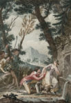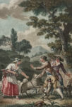 Paris, Defer de Maisonneuve, 1793. Grand in-4, maroquin brun, quintuple encadrement de roulettes dorées, cadre central lobé aux angles et orné grands fleurons dorés dans les angles et les milieux latéraux, dos lisse orné, pièce de titre rouge, roulette perlée sur les coupes, dentelle intérieure, tranches dorées (Reliure de l'époque).Élégante édition typographique, ornée de quatre figures hors texte du peintre Nicolas-André Monsiau, gravées sur cuivre par J.-Frédéric Cazenave et Nicolas Colibert et délicatement coloriées à la poupée – procédé qui en était alors à ses débuts. Cette illustration évoque les « bergeries » inspirées de L'Astrée et remises à la mode par Marie-Antoinette.