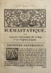 Pionnier de la physiologie expérimentale, Stephen Hales (1677-1761) fait état dans ce livre de ses travaux sur la force et la vitesse d'écoulement du sang chez divers animaux, mais aussi de ses expériences sur les calculs de la vessie. François Boissier de Sauvages a joint à sa traduction de l'ouvrage deux dissertations médicales sur l'inflammation et sur la fièvre, qui sont illustrées d’une planche gravée sur bois.