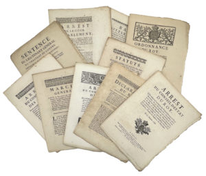 Importante collection d’impressions du xviiie siècle sur les poudres et salpêtres, la plupart au format in-4, brochées ou en feuilles, réunies dans deux emboîtages modernes Certaines sont des réimpressions d'ordonnances et d'arrêts du siècle précédent ; d'autres concernent la période révolutionnaire.