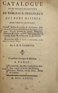 SAINT-AIGNAN (Duc de) — Catalogue d'une belle collection de tableaux originaux de bons maîtres des trois Écoles, figures, bustes de marbre & de bronze, d'anciennes porceliane de la Chine & du Japon, Lacques, pierres gravées & autres, médailles, estampes & objets curieux, qui composent le Cabinet de feu M. le Duc de S. Aignan. Vente du lundi 17 juin.