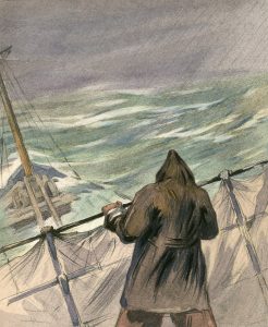Au large de l'Eden. Illustrations en couleurs de Henry Cheffer (vignette au titre, bandeaux, lettrines et compositions in-texte en coul., culs-de-lampe en noir). P., Piazza, 1947, 8°, plein chagrin bleu foncé, dos à 4 nerfs, titre, auteur et fleurons dorés, double filet doré d'encadrement sur les plats avec fleuron aux angles, tête dorée, couv. illustrée et dos cons. (reliure signée de H. Snoeck). Tirage limité à 1000 ex. num. 1/455 vélin de Lana contenant 1 suite en noir des illustrations.