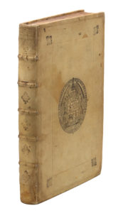 In-4, vélin rigide, double encadrement de filets à froid, fleurons aux angles et armoiries au centre estampés en noir, dos orné de fleurons en noir, tranches jaspées (Reliure de l'époque).Édition rare, parue sans titre ni achevé d'imprimer.