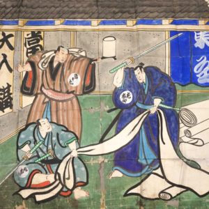 [JAPON] AUTEUR NON IDENTIFIÉ Samouraï, c. 1900 Grande gouache sur papier, texte manuscrit au verso. Manques, pliures, ancienne restauration. Dimensions : 104 x 104 cm.