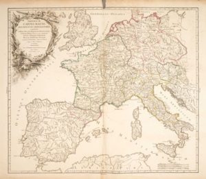 Carte géographique de l’Empire de Charlemagne "Imperium Caroli Magni Occidentis imperatoris completens, Galliam Hispanicam, Baleares insulas, Corsicam, Italiam…" Carte d’Europe occidentale de Robert de VAUGONDY, 1752 Dimensions : 53 x 76,5 cm. Grande carte issue d’un atlas, imprimée sur papier et mise en couleurs avec cartouche du titre et privilège du roi en haut de la partie gauche. Titre imprimé au verso : ‘Carolis Magni Imperium’. Mouillures et manque en haut du pli central.