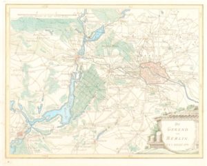 Die Gegend um Berlin 1790. Carte des alentours de Berlin, fin XVIIIe Gravure sur cuivre ancienne en couleur de Franz Johann Joseph von Reilly à Vienne. Encadrée à vue : 30 x 37 cm.