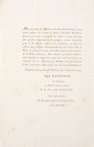 RÉUNION DE DEUX PIÈCES IMPRIMÉES DU 1ER EMPIRE - Invitation faite par Napoléon aux membres du Conseil d'État à assister au Te Deum du 3 décembre 1809 dans l’église Métropolitaine de Paris. 1 pièce in-folio avec texte et signatures imprimées, donnée dans le palais des Tuileries le 1er décembre 1809, signée Napoléon, Duc de Bassano, Locré. - 1 pièce in-folio imprimée, Liste des fonctionnaires publics parjures à leur serment, en jurant fidélité à Buonaparte, huit jours après avoir fait le serment à notre ROI LEGITIME.