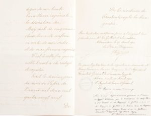 ORDRE DU MEDJIDIE - Un diplôme d’une page in-folio imprimée sur vélin avec mentions manuscrites à l’encre, fait à Versailles le 30 novembre 1872. Accordé à un secrétaire de l’Agence du Canal de Suez par la Grande Chancellerie de la Légion d’Honneur dans les Ordres Étrangers, conféré par le Sultan de Turquie. Signé Thiers et Joseph Vinoy. - 3 p. in-folio manuscrites à l’encre : Traduction de la Choghra du Sultan Abd ul Aziz certifiée conforme à l’original turc par le premier Drogman Henry Sauvaire, Alexandrie 27 avril 1872. - 1 p. in-fol. sur papier : autorisation à porter à la boutonnière la décoration de l’Ordre du Medjidié.