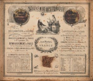 Souvenir historique 1870-1871 Morceau de pain du siège de Paris collé sur une carte souvenir des batailles de la guerre de 1870 et du siège de la commune de Paris. Sous encadrement moderne, à vue :14 x 16 cm.