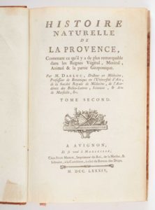 Histoire Naturelle de la Provence contenant ce qu'il y a de plus remarquable dans les Règnes Végétal, Minéral, Animal La Partie Géoponique, par DARLUC, à Avignon, chez Niel, 1782 et 1784 2 vol. in-8, demi-reliures de cuir frottées, dos ornés, pièces de titres à l’or à fonds colorés. Michel Darluc (1717-1783) docteur, fut nommé professeur de botanique à l'Université d'Aix où il fonda le premier jardin d'histoire naturelle. Il parcourt la Provence, s'intéressant à toute l'histoire naturelle, recueillant les informations nécessaires à son livre Histoire naturelle de la Provence, n'hésitant pas à descendre dans les mines de charbon de Fuveau et Gardanne. Les deux premiers tomes paraissent en 1782 et 1784. Devenu complètement aveugle, il meurt en 1783 sans avoir pu terminer le troisième tome. Son ami Gibelin se charge de revoir le manuscrit et le fait publier en 1786.