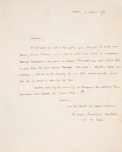 Henri Dominique LACORDAIRE (1802-1861) Lettre autographe signée adressée à Reboul, Soréze, 5 janvier 1857, 1 page in-4 sur feuillet double, adresse timbrée au verso. On m’a remis le volume des poésies que vous avez bien voulu me destiner, et en l’ouvrant j’en ai senti et gouté tout d’abord les parfums. Vous me demandez une prière en échange du plaisir que vous m’avez fait : je prie Dieu de nous conserver longtemps votre muse. Honnête, chaste et chrétienne, elle est un des ornements de notre siècle et une consolation pour ceux qui ont conservé le culte du vrai beau […]