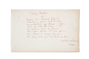 [MANUSCRIT] MARCELINE DESBORDES-VALMORE (1786-1859) L’horloge arrêtée, poème autographe signé Marceline Valmore, 1840. 1 page in-8 oblong à l’encre brune (traces de colle au verso et petits manques sans atteinte au texte). L’horloge arrêtée Horloge d’où s’élançait l’heure, vibrante en passant dans l’or pur, comme l’oiseau qui chante ou pleure, suivant que l’air est sombre ou sur, ton haleine égale et sonore dans le froid cadran ne bat plus : tout s’éteint-il comme l’aurore des beaux jours qu’à ton front j’ai lus ? L’horloge arrêtée fait partie du recueil de poèmes de Marceline Desbordes-Valmore Bouquets et prières publié chez Dumont en 1843 avec comme texte pour le quatrième ver : Dans un arbre où son nid est sûr qui remplace Suivant que l’air est sombre ou sur de notre exemplaire. Provenance : albums amicorum de la chanteuse lyrique Jane Bianchi.