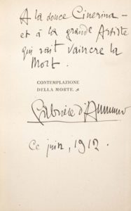 “Contemplazione della Morte”, G. D’ANNUNZIO, editeur Fratelli Treves Editori, Milano 1912 1 vol. plein maroquin havane à longs grains, plat à triple filet d’encadrement, dos orné et pièce de titre. In-4, tranches dorées. Dos légèrement frotté et mouillures sur les gardes. Porte un envoi “A la douce Cinerima et à la Grande Artiste qui sait vaincre la mort” daté Juin 1912.