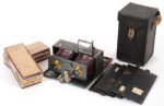 Caméra Stéréoscopique et Vues stéréoscopiques positives sur verres, vers 1905 - “Le Stéréoscope” Breveté S.G.D.G. France et Etranger : Caméra stéréo pliante en métal à soufflets, objectifs de type rectiligne rapide “BALBRECK Ainé Fils”. Viseur déployant, niveau à bulle, 6 chargeurs (12,5 x 5,2 cm), sacoche cartonnée noire, intérieur velours rouge, lanière cuir. (en l’état). - 48 vues stéréoscopiques positives sur verres dans boites légendées datées 1904 : voyage en France, Savoie, St Louis, New-York (bateaux, concert…). Dimensions : 4,2 x 10,5 cm.
