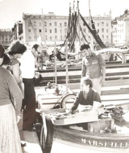 Jean RIBIERE (1922-1989) Marchande de sardines sur le Vieux Port de Marseille, 1944 Tirage argentique vers 1955. Tampon du photographe et légende tapuscrit sur vignette au verso. Dimensions : 23,6 x 20,4 cm Pliures dans les angles