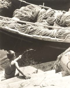 Jean RIBIERE (1922-1989) Enfant jouant près d’une barque, 1950 Tirage argentique d’époque. Tampon du photographe au verso. Dimensions : 25,8 x 20,5 cm.