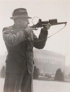 Photographe Non Identifié Le célèbre chasseur viennois Albert Messany avec son fusil photo, vers 1940 Tirage argentique d’époque. Légende tapuscrite en allemand au verso. Dimensions : 21 x 16,2 cm Traces de manipulations.