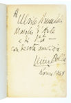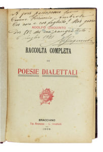 (57)Nella raccolta: Emilio Greco. Appunti di una vita. Palermo, Sellerio 1980 - Franco Donatoni. Antecedente X. Sulle difficoltà del comporre. Milano, Adelphi 1980 – Francesco Santoliquido. Il giardino di fuoco. Roma, Ausonia 1920 – Nino d'Angelo. L'ignorante intelligente. Milano, Mondadori 2000 – Bruno Liberatore. Catalogo della mostra presso la Galleria ai Fiori Chiari, Palermo. 1985 – Fuksas Massimiliano. La sciola materna di Tarquinia. Roma, Carte Segrete 1983 – Enrico Benaglia. Reale immaginario. Roma, Galleria Lombardi (con un'incisione firmata dall'artista) - Pietro Badoglio. L'Italia nella Seconda Guerra Mondiale. Milano, Mondadori 1946 – Treccani degli Alfieri. Enciclopedia Treccani. Come è e da chi è stata fatta. 1947 – Le ore. Poesie e disegni. Di Mario Lucchesi, Paolo Budini, Alberto Mattei (la dedica è di Mattei). Grosseto, Eco Maremma s.a. - Goliarda Sapienza. L'arte della gioia. Nuovi equilibri 1994 – Gaetano Manera. Marconi e la sua voce. Roma 1953 – Carlotta Mandel. Notturne (II edizione). Studio letterario milanese 1943 –Mario Missiroli. Cosa deve l'Italia a Mussolini. Roma, Edizioni di Novissima XV –Antonino Anile. La croce e le rose. Napoli, Ricciardi 1909 – Giovanni Orsini. Le doriche. Bologna, Cappelli 1927 – Marco Ramperti. Suor Evelina e le belle mani. Milano, Editrice degli Omenoni 1930 –Giuseppe Lipparini. Le foglie dell'alloro. Bologna, Zanichelli 1916 – Luigi Russo. Michele Barbi. Milano, Casa del Manzoni 1942 – Maria Mariani. L'Aniene racconta. Milano, Cibelli 1952 – Mario Appelius. Le isole del raggio verde. Milano, Alpes 1929 –Salvator Gotta. Tu, la mia ricchezza. Milano, Baldini & Castoldi 1930 – Salvator Gotta. Il paradiso terrestre. Milano, Baldini & Castoldi 1935 – Adolfo Giaquinto. Raccolta completa di poesie dialettali. Bracciano, Tip. Romana 1909 – Renato Fucini. All'aria aperta. Firenze Bemporad 1914 (solo firma) – Piero Iacchia. Un figlio della terra. Città di Castello, Il Solco 1920 – Giovanni Bucci. L'amante di mia cugina Arezzo. Editoriale Italiana 1928 - Nino Bolla. Eleonora Duse. Roma, De Luigi Editore 1945 – Gico. Viaggiando s'impara che se sta meglio a Roma! Roma, Coluzza 1960 – Angelo Antonio Fumarola. Sensazioni del Belgio. Pisa, Nistri 1940 - Walter Trillini. Principessina del mio paese. Milano, Centauro 1937 – Walter Trillini. Sarà pieno il mio tempo. Roma, La Genialissima 1933 – Walter Trillini. Con la luce negli occhi. Roma, La Laziale 1933 – Juan Chabas. Dedica su ritaglio di giornale conservato in rivista –Ernest Newlandsmith. The man of God. London, The new life moment 1926 - Mario Appelius. L'aquila di Chapultepec. Milano, Alpes 1929 – Edgar Sievers. Flying saucer ueber Suedafrica. Pretoria, Saggitarius 1955 – Chabas y Martì. Espejos. Madrid, Pueyo 1921 – Riccardo Testa. Ricordi piemontesi. Roma, Estratti dal Costume 1948 – Yuki. 20 years. London, Victoria and Albert Museum 1992 – Paola Rivetta. Il cinghialetto ghianda. Sallustiana 2000 – Renzo Barbera. Il giardino zoologico di Renzino. E.S.A. s.a. e altri 14 volumi.