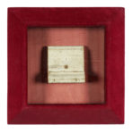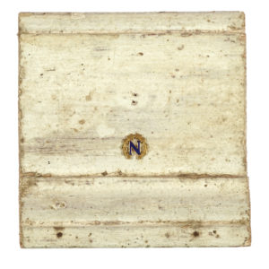 Elemento ligneo ritagliato dal rivestimento interno originale della Longwood House. Conserva l'antica pittura originale opaca color beige chiaro sul lato visibile, mentre retro e tagli sono in legno grezzo. Al centro, piccola decorazione napoleonica metallica smaltata e dorata (non coeva). Sul retro è applicata l'autentica con firma autografa del console di Francia. Dimensioni: 125x130 mm. L'elemento ligneo è conservato all'interno di un cofanetto rosso con vetro. Dimensioni: 400x400 mm ca. (1)Straordinario reperto storico dell'ultima dimora di Napoleone I, che a Longwood House morì il 5 maggio 1821. L'autentica incollata sul retro, dattiloscritta su carta intestata Consulat de France Ile de Sainte–Helène, è datata Octobre 1964; presenta il sigillo in ceralacca e il timbro del Consolato francese a Sant'Elena ed è firmata di pugno da Gilbert Martineau, Consul de France. Nell'autentica si legge: Fragment de la boiserie de l'appartement de l'Empereur Napoléon à Longwood House, Ile de sainte-Helène. Martineau è il noto personaggio che, in qualità di console nonché curatore delle proprietà francesi a Sant'Elena, dal 1956 si occupò del restauro di Longwood House, dimora che dall'anno 1858 appartiene al governo francese, pur essendo su territorio britannico. Martineau è anche autore di vari libri sull'argomento, tra i quali spicca: Napoléon à Sainte-Hélène: 1815-1821.