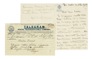 Manoscritti a inchiostro nero. Lettera di 4 pagine su carta intestata Casa di S.A.R. Il Duca degli Abruzzi. Storico telegramma (di altra mano), in cui Cagni informa della conquista del monte Saint Elias. Vi si legge Vergine vetta S. Elia raggiunta dalla completa comitiva 31 luglio mezzodì Cagni. Insieme alcuni ritagli di giornale di epoca successiva. Dimensioni varie. (2)Cagni, ammiraglio ed esploratore (1863-1932) partecipò a numerose spedizioni: con la nave scuola della Regia Marina Cristoforo Colombo nel viaggio di circumnavigazione,); fu comandante in seconda della spedizione al Polo Nord della Stella Polare e alla conquista della vetta del monte Saint Elias in Alaska. Questa lettera, scritta al console d'Italia Lecca, da Seattle a Sitka, a bordo della City of Topeka, si riferisce a quella impresa: [...] Siamo arrivati fin qui benissimo accolti [...] A Seattle solamente moltissima indifferenza [...] perché non vi abbiamo fatto le provviste [...]. La disillusione non ha prodotto altro che un articolo del Seattle Post Intelligencer, il quale piglia un po' per i pantaloni la nostra spedizione e in particolare il sottoscritto [...]. La nave è d'uno sporco che fa schifo e scuote talmente che le cuccette ballano continuamente [...].