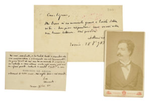 De Amicis Edmondo, Ritratto fotografico all'albumina dello scrittore con dedica autografa, 1 cartolina e 1 biglietto da visita autografi. Datati 1880 e 1903.