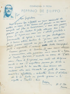 Un manoscritto a penna blu e tre dattiloscritti a inchiostro nero. Tre carte intestate Compagnia del Teatro Italiano Peppino de Filippo, e una Peppino de Filippo. Conservate due buste intestate e una carta intestata della Compagnia, scritta e firmata da altra persona. Dimensioni: 225x285 mm. (5)Le lettere trattano di impegni teatrali e cinematografici, ma non mancano le note personali: [...] mi sono convinto che mettere in scena il tuo lavoro, nel periodo in cui sono occupato col film in lavorazione, è una vera preoccupazione per me [...] non mi pare vantaggioso, per il lavoro stesso, tentare la prima senza aver potuto trovare neanche un paio di volte [...] Penserei quindi di [...] rimandare alla prossima mia venuta a Roma, al Teatro Quirino, l'andata in scena de L'abito nero [...] (18 maggio 1953). [...] il mio guaio [...] è che non sono tipo di troppe parole e allora, a volte, mi si crede uno scontroso e spesso mi si tiene lontano volentieri [...] (23 gennaio 1953).
