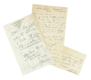 Manoscritti a matita grigia. 34 pagine scritte in totale. La prima lettera è composta da 7 bifoli numerati, intestati Hôtel Cavour Milan, senza data. 26 pagine, scritte di getto nel tipico stile della Duse, in orizzontale e in verticale, con molte sottolineature. Dimensioni 140x220 mm. La seconda lettera è composta da 1 bifolio. 4 pagine scritte in orizzontale e verticale. Non datata. Dimensioni 135x210 mm. SI AGGIUNGE: Id. 1 biglietto autografo a matita nera, siglato, in francese. Non datato. (3)I DOCUMENTO: Prima lettera. Lunghissima epistola (epitre, come la chiama la Duse) dedicata alle sofferenze provocatele dal Signor Enfisema e alla - purtroppo vana - speranza di trovare rimedi e cure in grado di guarirla. Domenica. Cara, cara anima [...] in queste giornate di freddo acuto varesino penso tanto che, come me, il lago di Locarno quanto quello di Varese non sono buoni per questa estate [...] ho incontrato a Varese [...] il dottor Pescarolo un piemontese che, oggi, con Forlanini [dott. Carlo], ha il primato sulle malattie di petto [...] Ma, questo mio amico enfisema è ingombrante. La Lesione Polmone, antica conoscenza mia, come sapete, è remissiva, ed essendosi già messa in disparte 25 o 28 anni fa, credo, che ora roderebbe piano piano, senza scombussolarmi, ma chi invece è importuno, villano, male educato, è il Signor Enfisema che appena sente il freddo. Bum! Gonfia e soffoca ... e io sola so che importuno e villano inquilino del mio petto è questo stupidone [...] la cosa più urgente sia cercare il sole, perché senza aria secca e calda l'enfisema non si cheta [...] bisogna agire per lui, e non per l'altra parte del polmone [...] dal 15 luglio al 30 agosto si può far molte cose, e io, tenace, e marinaresca di razza, tenterò di accogliere il vento come sarà a profitto della mia barca! Cara, saggezza è rimanere, saggezza è ancora, tirare di "bordo" quando il vento è contrario. Il mare della vita non ha una strada, ma infinite che guidano al mare [...] L'importante è tenere il filo che all'anima rileva. Il resto, pur di non asmare, pur di mandar via quest'asma figlia del Signor Enfisema io andrei perfino [...] se ancora vi sperassi! [...] Duse. Seconda lettera: Si, cara, ho avuto un'ora di serena gioia vedendo Yvette Guilbert [artista e scrittrice francese]. Una che è: Arte. Cara, questa vostra eretica amica, che tanto vi ama e vi ricorda, ha nel suo cuore la parola Arte forte e lucente come una fede come una Religione. Cara, tutto dell'arte è per me consolazione e poesia, e la vita mi par così triste, oggi, che le sono così lontana, così lontana dal Tempio! [...]. II DOCUMENTO: Terza lettera: Dimanche. Chère Trude, je n'ai pas pu partir depuis le jour du concert. Souffrante, et couchée presque tous les jours. Henriette [Enrichetta, la figlia della Duse] arrive aujourd'hui à Florence ! [...] J'espère vous revoir à mon retour dans une semaine. Tendrement.