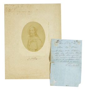 Manoscritto a inchiostro nero, su carta azzurra. Una pagina scritta. Dimensioni 130x205 mm. SI AGGIUNGE: Rovelli Pietro. Lettera autografa firmata, inviata a Giuseppe Garibaldi (con annotazione autografa di Garibaldi). Datata Como 16 dicembre 1859. SI AGGIUNGE: Ritratto fotografico di Garibaldi (albumina ovale da litografia del 1849). Passe-partout timbrato Fotografia Bertinazzi Bologna, con firma - G. Garibaldi - (non autografa). Dimensioni ovale 100x125 mm, passe-partout 240x320 mm. (3)I E II DOCUMENTO: Le due lettere, originariamente unite con ceralacca (oggi staccata) sono state inviate al Sig. Pozzi. Nella lettera di Garibaldi si legge infatti: - A tergo della lettera del sig. Marchese Rovelli ho scritto alcune parole di raccomandazione che le potranno servire. La saluto di cuore. Suo G. Garibaldi. La lettera di Rovelli è una raccomandazione a Garibaldi in favore del sig. Matteo Pozzi, di Como, che si era introdotto valorosamente nell'accampamento austriaco del generale Urban alla Camerlata. Scrive Rovelli: [...] col mezzo suo potei poscia immediatamente notiziare lei, Illustre Generale, a Varese, dell'attacco che doveva seguire alle ore tre del susseguente mattino [...] Aff.mo Rovelli Pietro ex capitano. Al verso, l'annotazione autografa (firmata) di Garibaldi: Fino, 16 dicembre 1859 Io raccomando in conseguenza de' servigi prestati [...] Nazionale il sig. Matteo Pozzi. G. Garibaldi. Il luogo (Fino Mornasco), la data, 16 dicembre 1859, e il nome di Pietro Rovelli sono legati alla curiosissima storia del matrimonio lampo di Garibaldi, grande tombeur de femmes. Nel gennaio del 1860 Garibaldi, che ha già 52 anni, sposa a Fino Mornasco la diciottenne Giuseppina Raimondi. Non sa che l'avvenente fanciulla ha già alcuni amanti, tra i quali l'ufficiale Luigi Caroli e lo stesso Pietro Rovelli, che, alla fine della cerimonia nuziale consegna al generale una lettera anonima in cui svela la tresca della neo-sposina con l'ufficiale Luigi Caroli (omettendo la propria). Giuseppina Rovelli viene ripudiata seduta stante e Caroli finisce in disgrazia. Pochi mesi dopo avrà inizio la spedizione dei Mille.