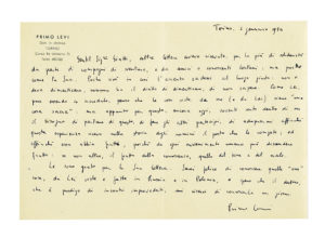 Manoscritto a inchiostro nero. Una carta oblunga, intestata Primo Levi - Dott. in chimica – Torino – C.so Re Umberto 75. Busta viaggiata conservata: anche l'indirizzo originale è autografo (aggiunto da altra mano: Albergo Italia - Matera). Dimensioni 205x140 mm. (1)Primo Levi scrive: Gentile Sig.na Giatti, altre lettere avevo ricevuto per lo più di solidarietà da parte di compagni di sventura, o da amici o conoscenti lontani: ma poche come la Sua. Poche cioè in cui l'accento cadesse al luogo giusto: non si deve dimenticare, nessuno ha il diritto di dimenticare, di non sapere. Come Lei, pure essendo io incredulo, penso che le cose viste da me (e da Lei) siano una cosa sacra [...] ancora oggi, sovente sento dentro di me il bisogno di parlare di questo, di fare gli altri partecipi, di adoprarmi affinché questa esperienza riceva nella storia degli uomini il posto che le compete [...] poiché da ogni avvenimento umano può discendere un frutto: se non altro, il frutto della conoscenza, quello del bene e del male [...] Primo Levi. Questa lettera, commovente e bellissima, è stata inviata a Nadia Giatti presso l'U.N.R.R.A. - CASAS (acronimi dell'United Nations Relief and Rehabilitation Administration - organizzazione assistenziale americana - e del Centro Autonomo di Soccorso Ai Senzatetto), enti di cui la Giatti era capogruppo e Adriano Olivetti instancabile promotore; a loro si deve anche la riqualificazione dei Sassi di Matera.