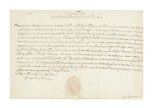 Manoscritti a inchiostro bruno. 4 pagine scritte in totale. Sigilli in carta conservati. Dimensioni varie. (4)La raccolta comprende: lettera datata 28 aprile 1679 inviata al viceré di Napoli a proposito del passaggio di una galea toscana - lettera datata 6 settembre 1695 inviata al cardinale Colloredo (con firma e annotazione autografa di Cosimo III) relativa ad un noviziato nel convento di S. Croce – Lettera datata 31 maggio 1707 inviata a al marchese conte di Gallarate nella quale si complimenta per il suo matrimonio con Camilla Avogadria Mezzabarba - Lettera patente in favore di Ferdinando Velluti permutato da Portoferraio a Livorno (21 settembre 1718).