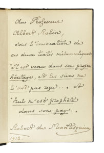 Manoscritto a inchiostro nero. Dedica al foglio di guardia. Legatura in mezza pergamena. Dimensioni: 190x125 mm. (1)Edizione tedesca della raccolta di poesie dedicata a Franzoska Steinitz. Con un ritratto del conte Robert de Montesquiou. Dedica autografa: «Au Professeur / Albert Robin, / sous l'invocation de / ces deus textes mélancoliques: / Il est venu dans son proper heritage, et les sien ne l'ont pas recu... et nul n'est prophète dans son pays. Robert de Montesquiou 1912.». Albert Robin (1847-1928), medico, ebbe tra i suoi pazienti Stephan Mallarmé e Marcel Proust. Appassionato di letteratura e di arte, Robin collezionò quadri di autori impressionisti, tra cui Edouard Manet (oggi conservati al Guggenheim, al Musée d'Orsay e al Museo di Belle Arte di Digione).