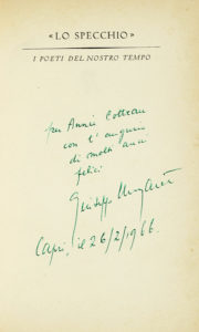 Manoscritto a inchiostro verde. Dedica all'occhiello. Brossura originale con velina protettiva. (1)Dedica autografa scritta da Capri: «per Annie Cottrau / con l'augurio / di molti anni / felici / Giuseppe Ungaretti / Capri, il 26/2/1966».